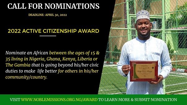 The Active Citizenship Award is an annual recognition of young Africans (between the ages of 15 and 35) living in Africa, who go beyond their civic duties to uphold democracy, improve access to basic amenities, realize the SDGs or improve the quality of life in their communities/countries in Africa. The award seeks to encourage young people to regularly take action that contributes to upholding democracy and achieving the UN Sustainable Development Goals (SDGs).