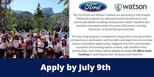 The Ford Fund and Watson Institute have launched this fully-funded fellowship for advanced social entrepreneurs and community leaders building ventures that create impactful and scalable innovations within the areas of economic mobility, education and social entrepreneurship.