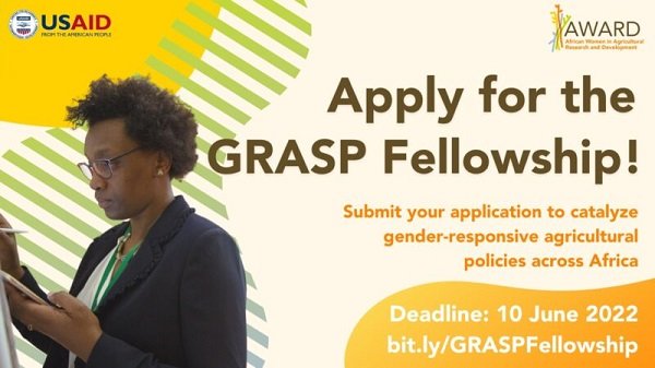 The application period for the Gender Responsive Agriculture Systems Policy (GRASP) Fellowship will close on June 10, 2022, 23:59 East Africa Time (GMT+3). Late submissions will NOT be accepted.