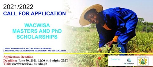 Applicants should submit full complement of documentation to wacwisa@uds.edu.gh and copy director_wacwisa@uds.edu.gh with a subject line “WACWISA Masters and PhD scholarships”